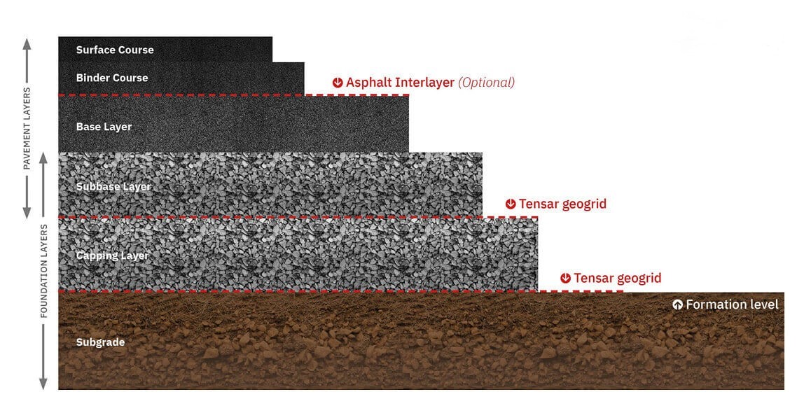 In this road structure diagram, note that Tensar geogrid can be used between the subgrade, capping, and subbase layers to construct stronger highway foundations that perform well over time.